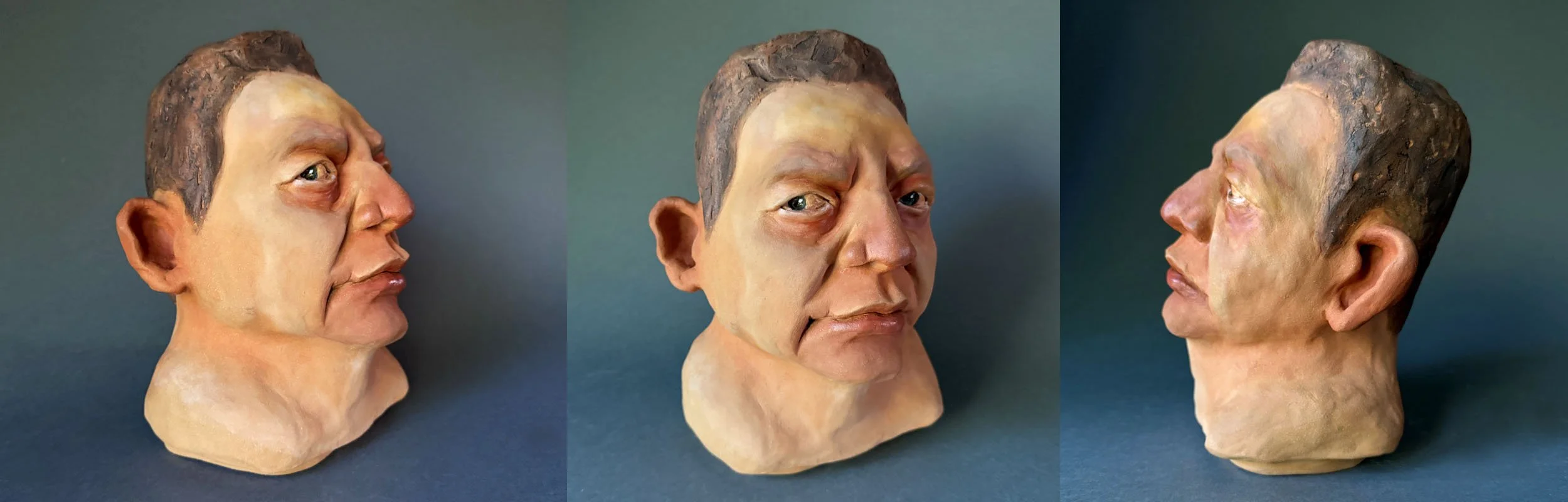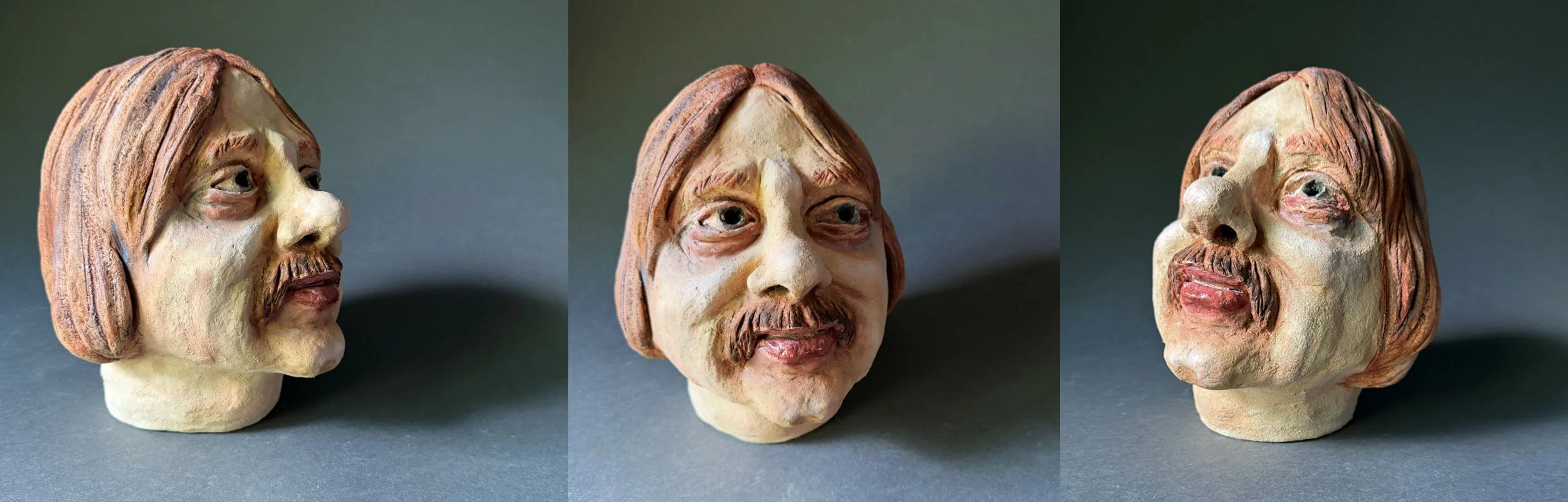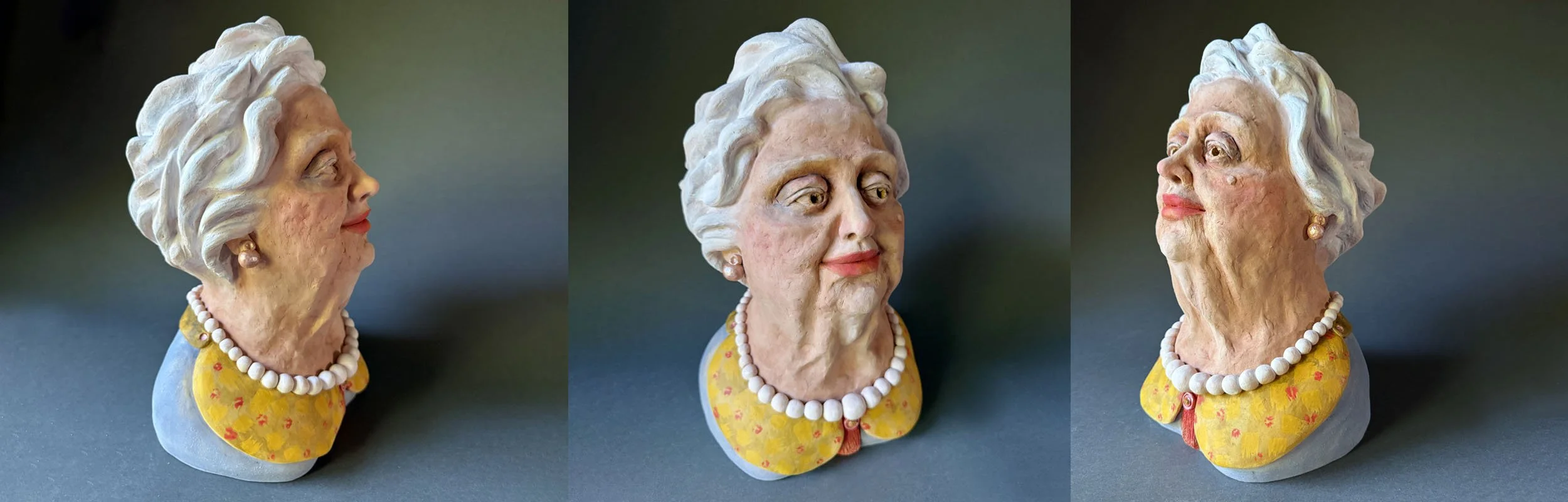 CHESTER: Leland Oral Historian | $750 | 2025 | Fired Clay, Mixed Media Finishing | 9”W x 11.7”H x 7..75”D