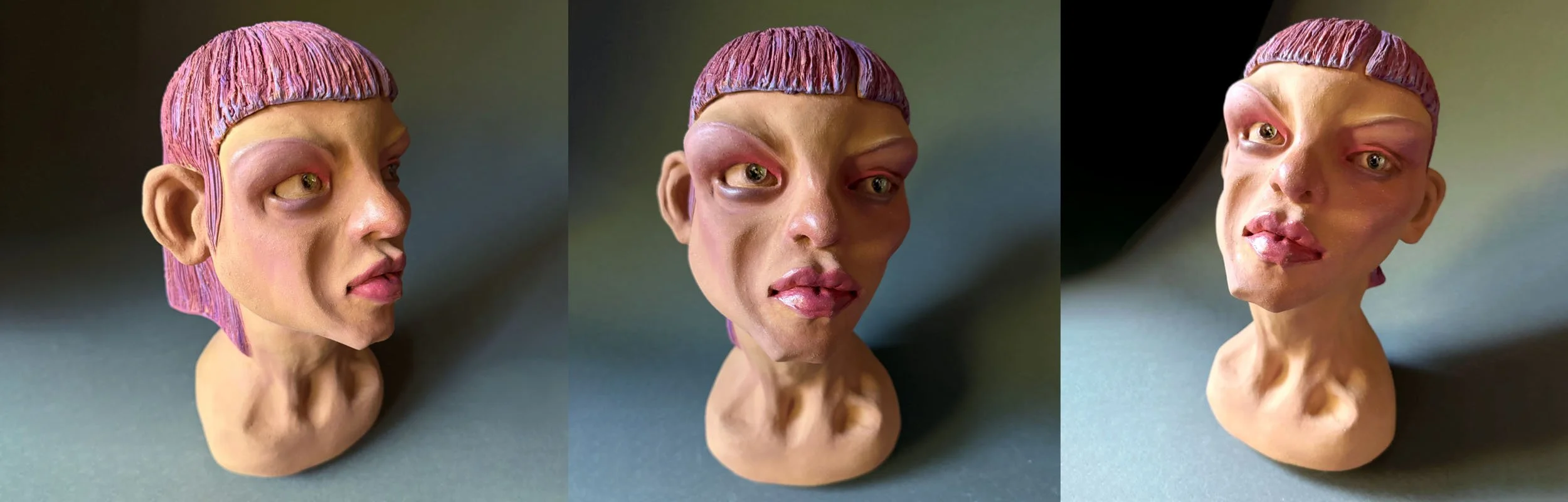 RANDY: Detroit Paint Shop Helper | $450 | 2025 | Fired Clay, Mixed Media Finishing | 7.25”W x 8.75”H x 7.5”D